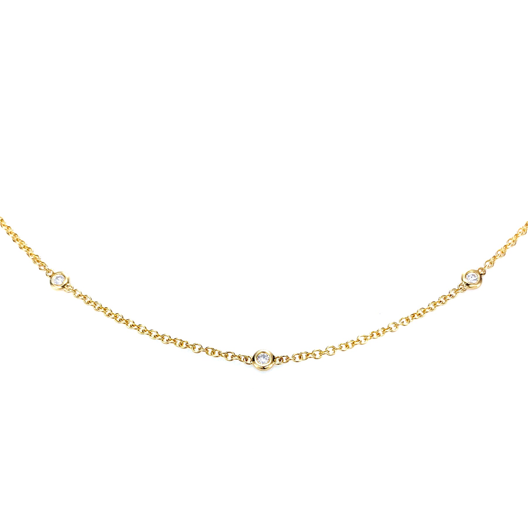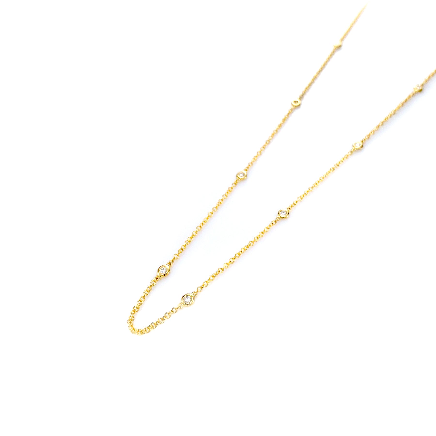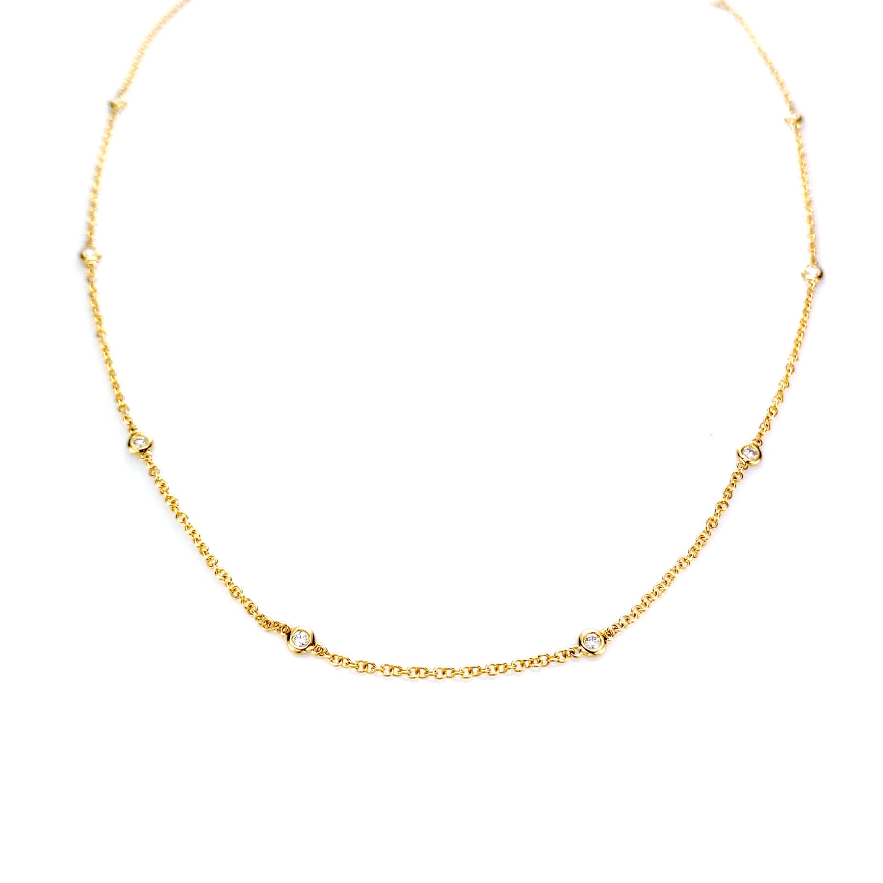 18K Yellow Gold Diamond Necklace. There is 10 Brilliant Round cut diamond on the necklace and diamond is set in bezel setting.