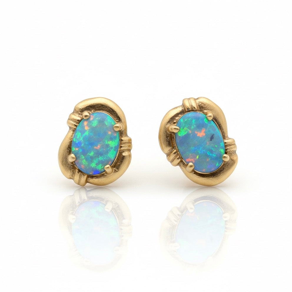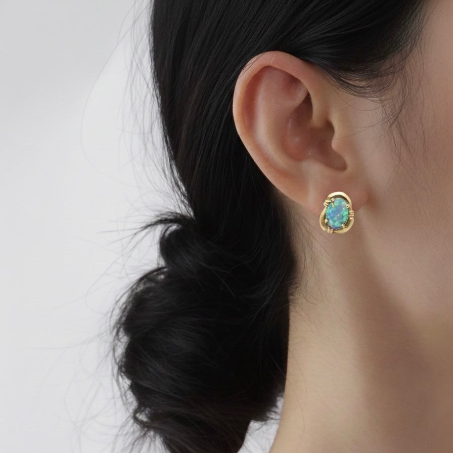Sparkle with this rare 9K Yellow Gold 2 Opal Stud Earring. There are 2 Oval Cut Blue Opal on the earring. All stones set in claw setting.