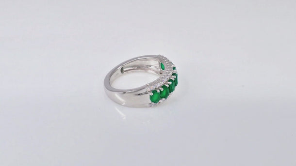 10K White Gold Lab Grown Emeralds and Lab Grown Diamonds Ring. There are 7 centre oval Shape lab grown emeralds and 30 side round lab grown man made diamonds on the ring. All Lab grown stones are set in a claw setting.