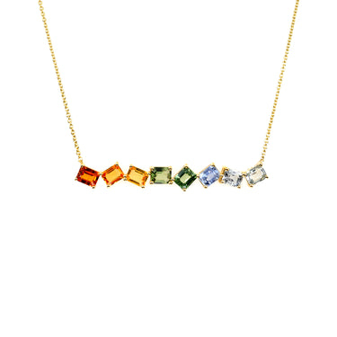 18K Yellow Gold Multicolour Stone Necklace. There are 8 emerald cut multicolour stone on the necklace. All stones set in claw setting.