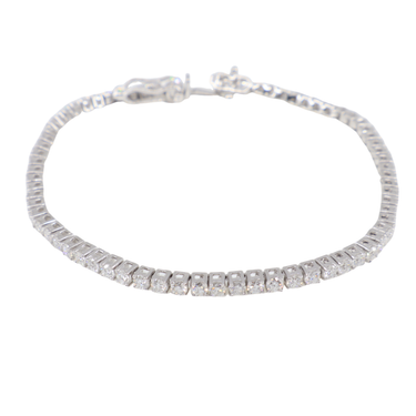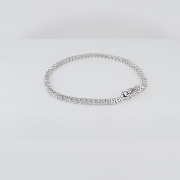 9K White Gold LAB Grown Diamond Tennis Bracelet. There are 72 Brilliant cut round Lab Grown man made Diamonds on the bracelet set in a four-claw setting.